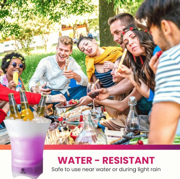 Transforme seus encontros e festas em eventos inesquecíveis! Este balde de gelo portátil e dobrável combina funcionalidade essencial para manter suas bebidas geladas por horas, com entretenimento de alta qualidade, graças à sua caixa de som Bluetooth e luzes LED.